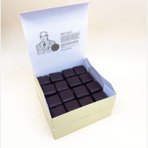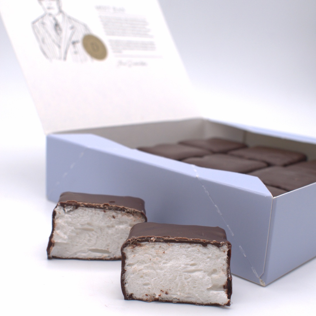 Guimauve artisanale fondante à la vanille, coupée en cube puis enrobée de chocolat belge noir, sa double texture gourmande vous fera immédiatement retomber dans vos souvenirs de délices d’enfance.