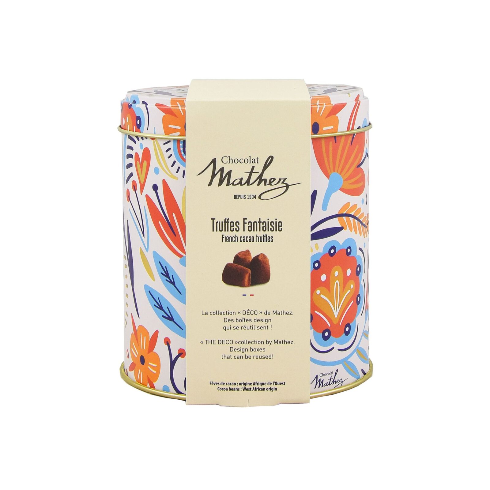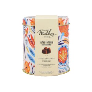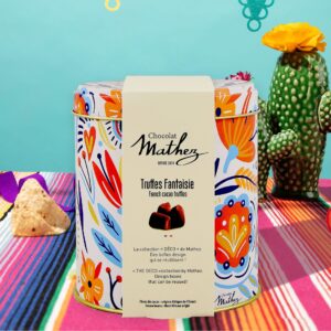 Chocolat Mathez vous propose ses truffes Fantaisie aux éclats de caramel au beurre salé, présentées dans sa nouvelle boîte métal «Mexico» qui vient enrichir la gamme et qui, une fois encore, frappe avec sa touche d’originalité. Produit sans huile de palme.