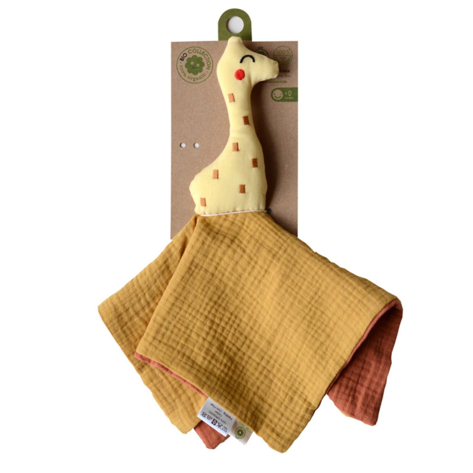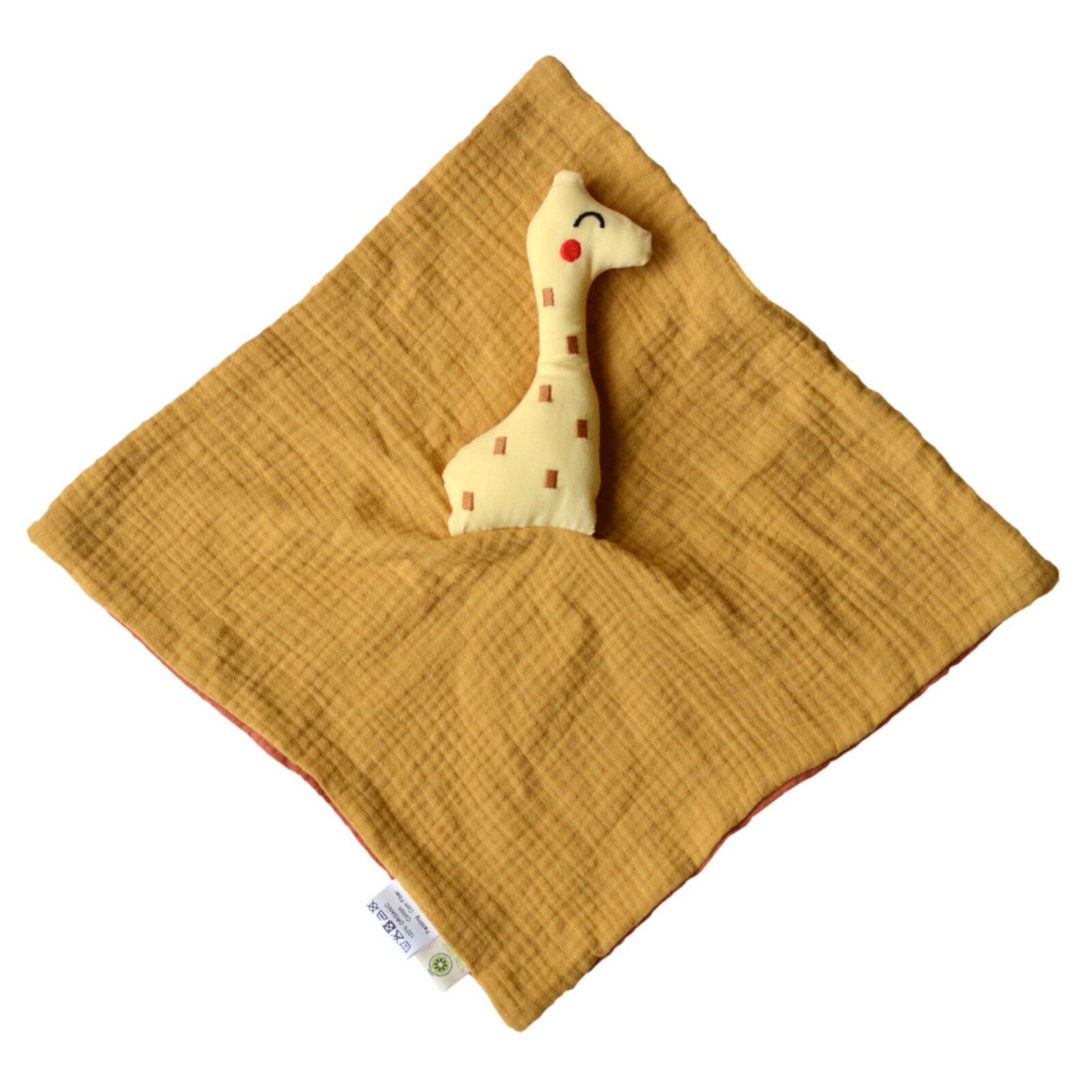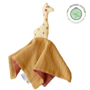 Doudou girafe est fabriqué en coton bio certifié Gots et sa tête est rembourrée en fibre de maïs.