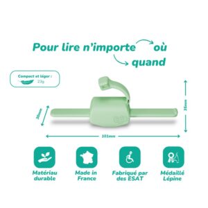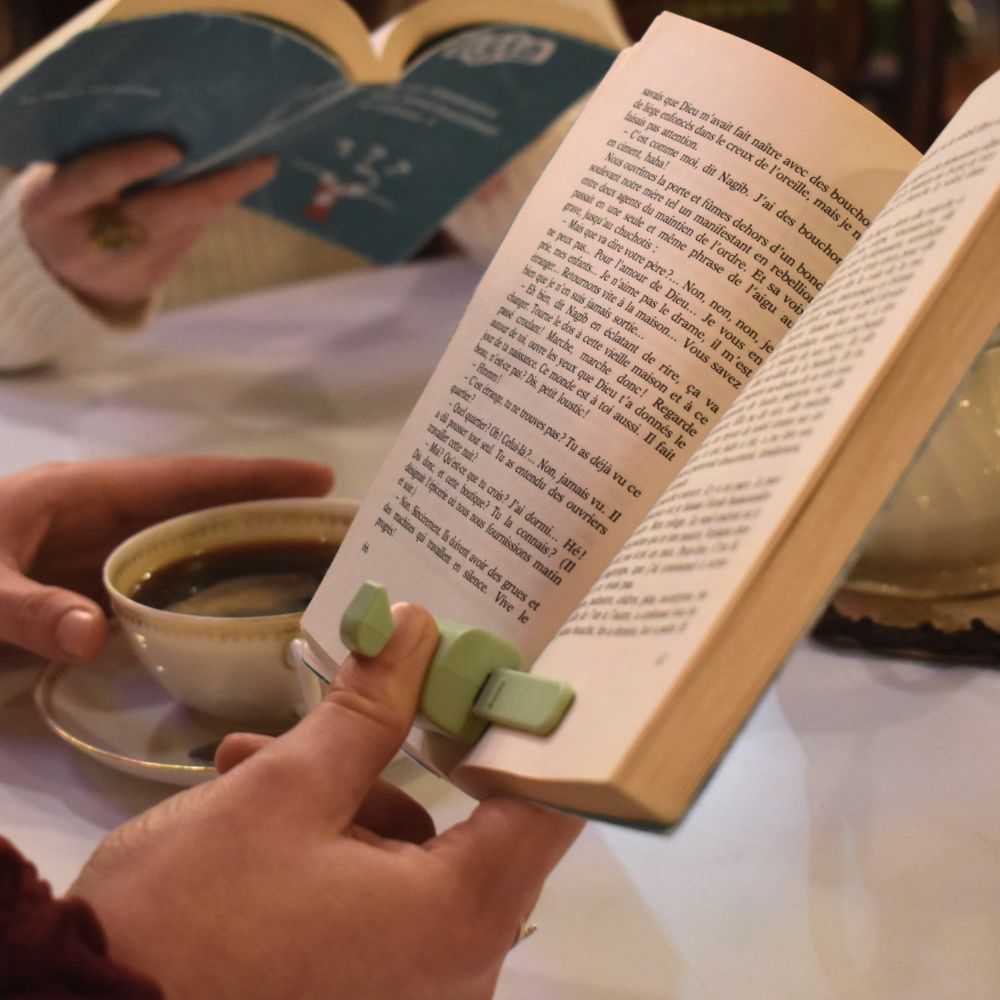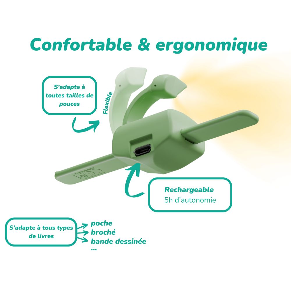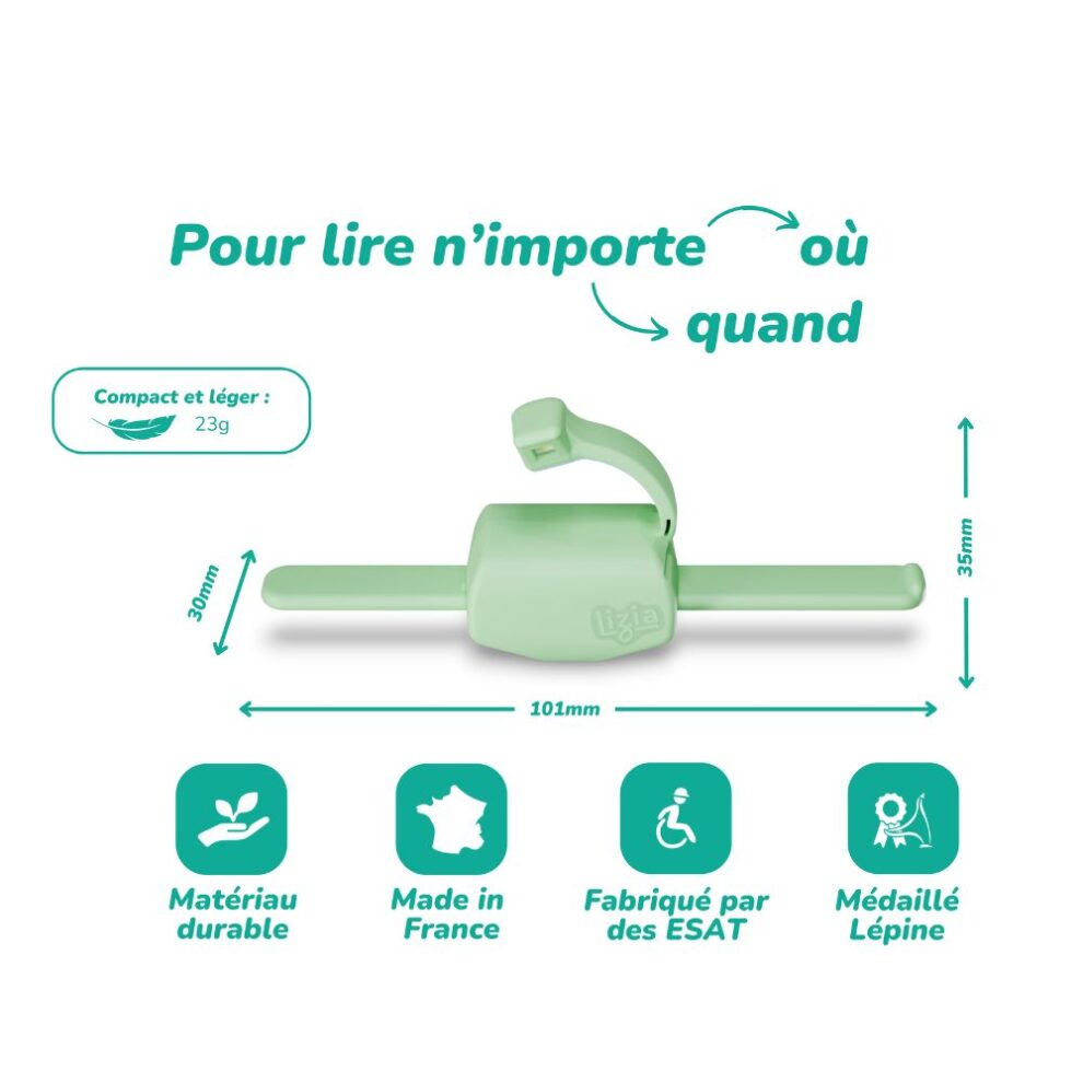Lizia est l’accessoire de lecture 3-en-1 indispensable pour tous les amoureux de livres. Conçu en France par deux ingénieurs passionnés, ce petit outil malin combine porte-page, lampe de lecture LED intégrée, et marque-page, le tout dans un format compact, léger et écoresponsable.