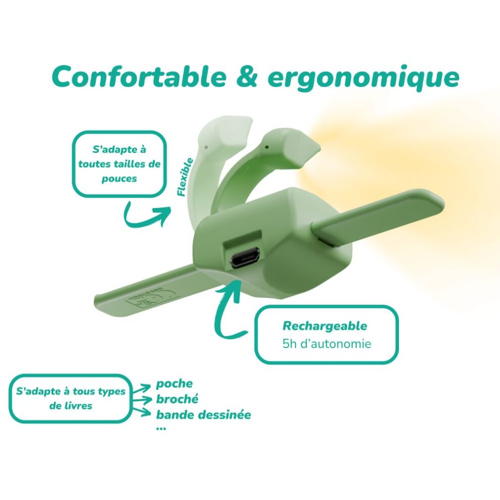 Redécouvrez le plaisir de lire avec Lizia, la lampe de lecture 3-en-1 médaillée au Concours Lépine. À la fois porte-page, marque-page et lampe LED, Lizia offre un confort de lecture incomparable. Ergonomique et légère, elle maintient vos pages ouvertes, éclaire votre livre en douceur sans gêner votre entourage et s’adapte à tous les formats du poche au grand roman. Rechargeable par USB, elle propose une longue autonomie et une intensité lumineuse réglée pour éviter la fatigue visuelle.
